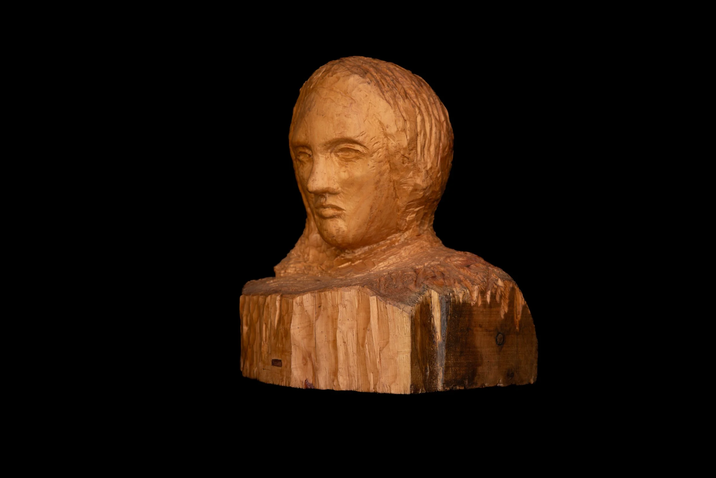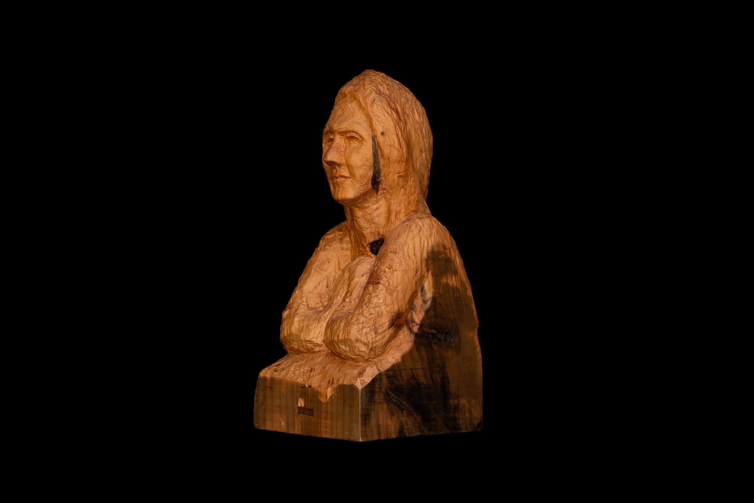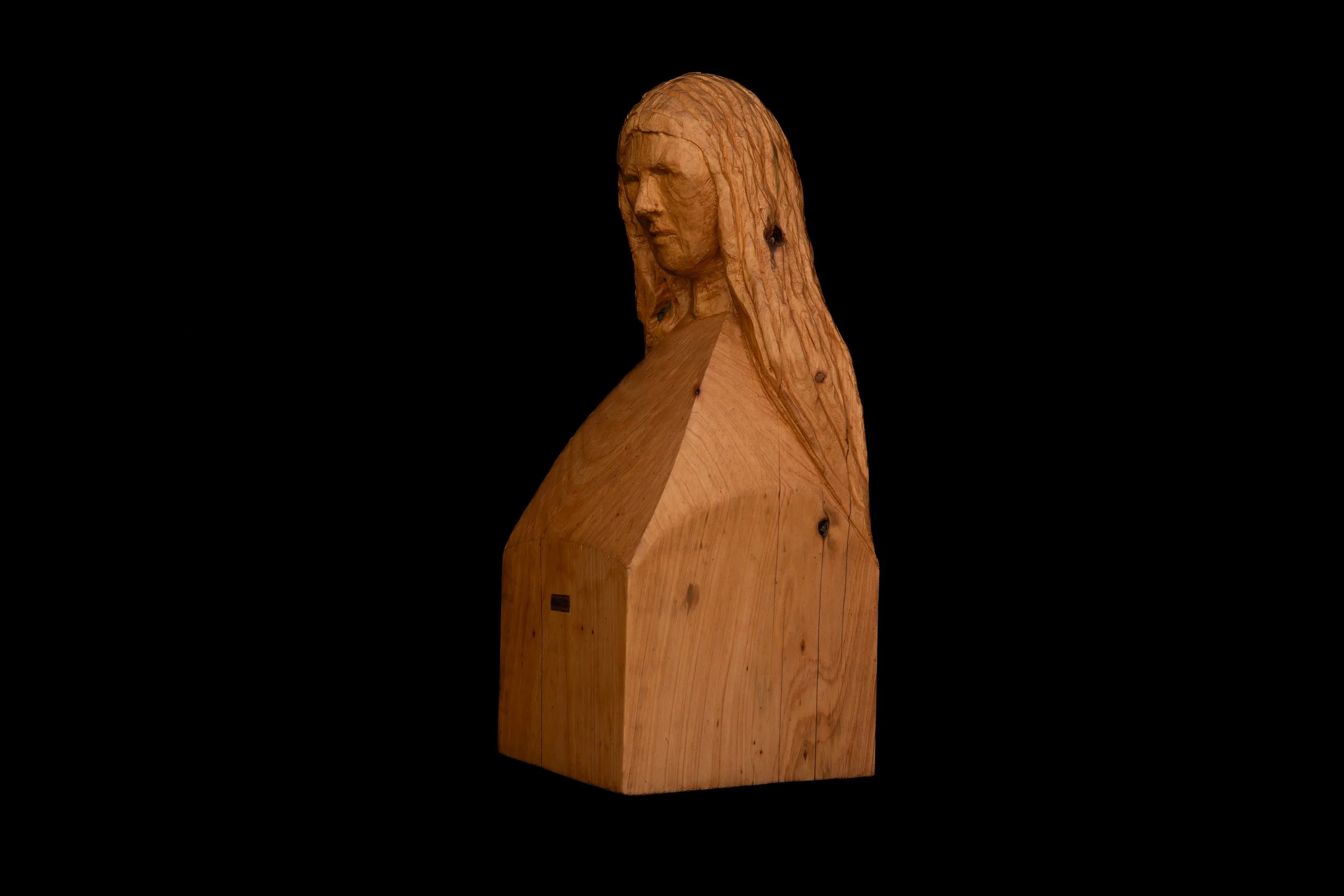 ‘Wisened’, seemed to always have a gentle, forthright and a sensitivity that was felt in the process of creating her. Not all faces are easy to create, often expressing a blind spot in myself. This one though, came from a more matured, wise part of myself. 530 x 245 X 245. Cypress pine.