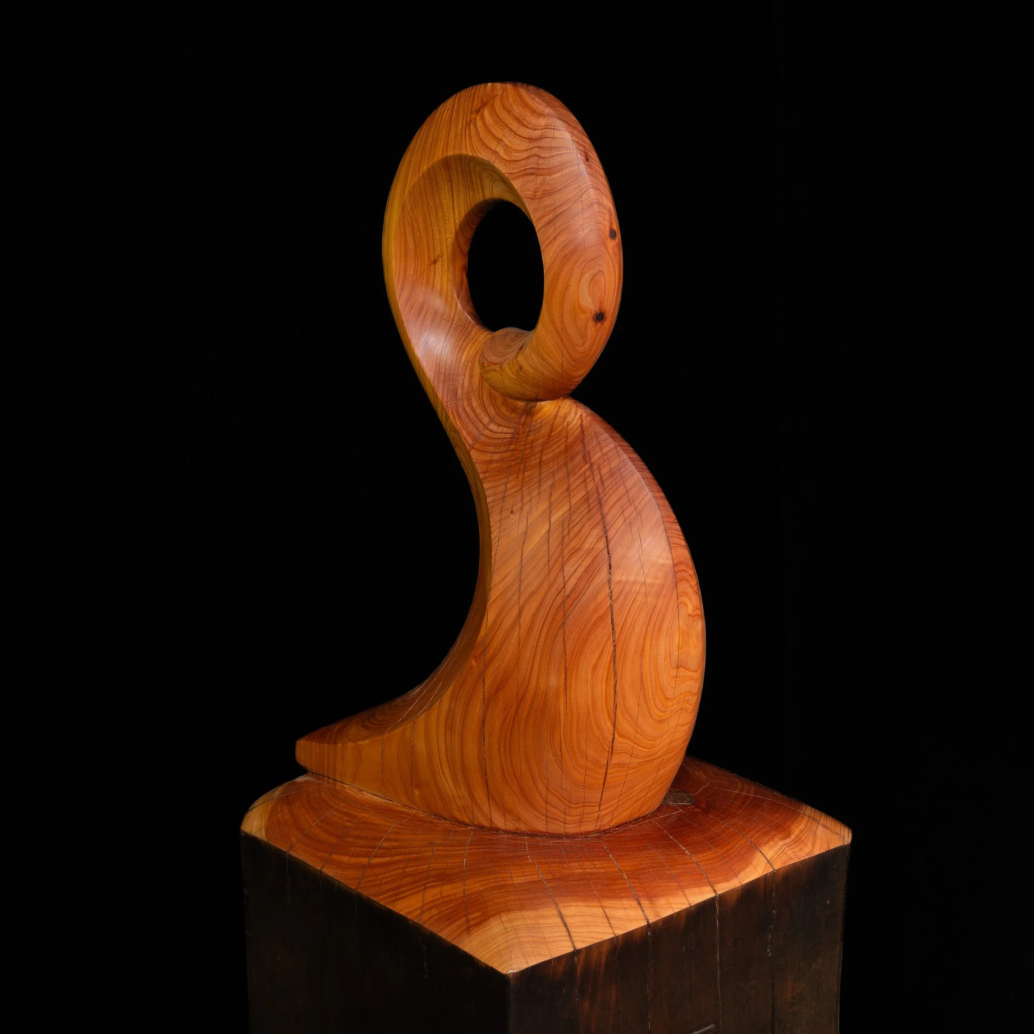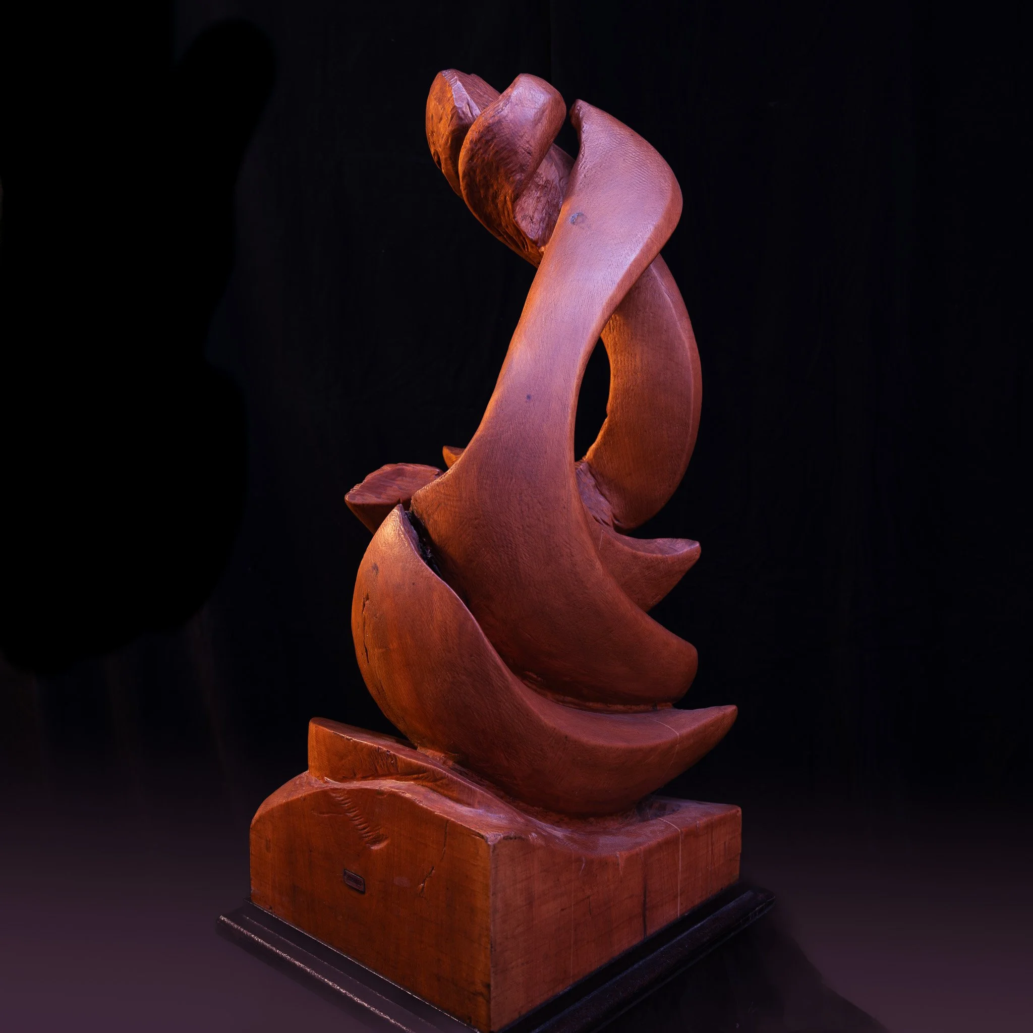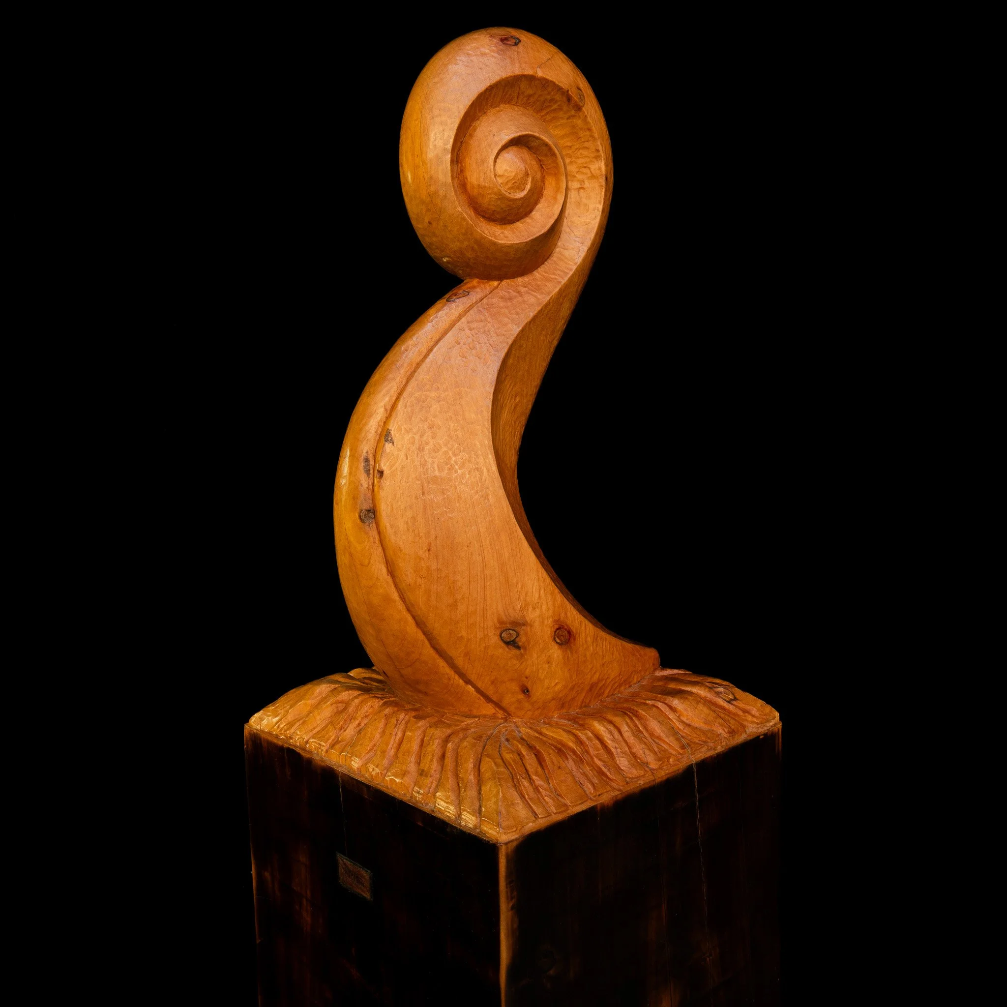 ‘Sound Shell’, suggests a musical instrument that evolved from life and it’s unfurling magic. If it could make noise, it would be an ancient echoing roar, found deep within remains of a forest floor. Celery Top pine from Tasmania - 1620 x 290 x 220. Carved section 850 x 270 x 190. Base and carved section one solid piece. Mounted onto a metal base at 355 X 295 X 25. Overall height of 1645.