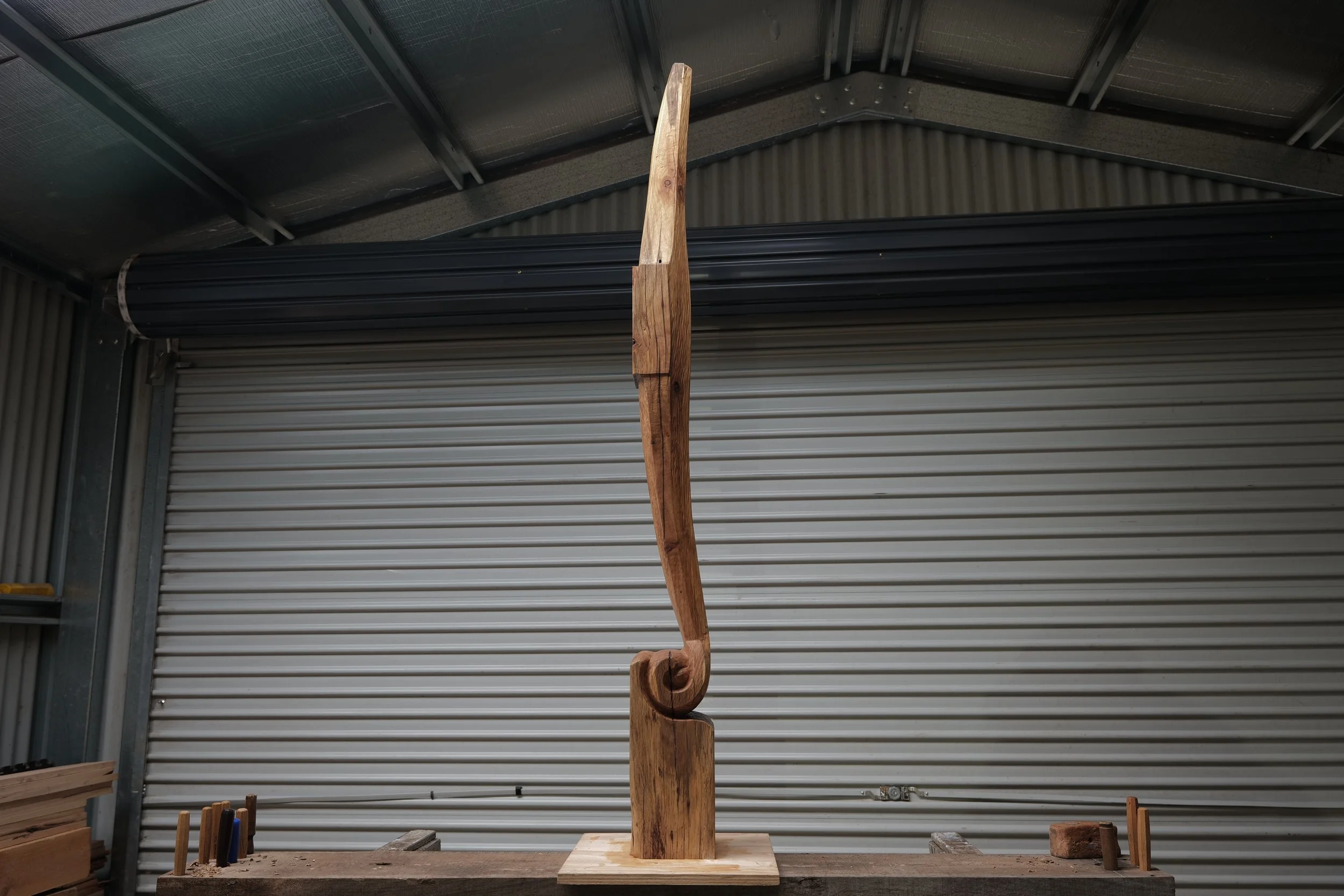 ‘Unfurling’ began through a call of inspiration to find my connect to carving again. Connecting to the sensual process of wood, visceral flow, the stream of consciousness and stillness of mind in the creative process. With this piece, I elected not using power tools. Rather I focus on connection to a repetition of tapping with mallet and chisel. Using a keen eye to observe and appreciate direction of line. Not once here had I brought a pencil to the making of marks, suggesting which way I should guide the chisel. The chisel became the guide and my mind observed. Possible timber variety is Messmate. Carving block size - 980 x 190 x 190. Mounted onto a metal base at 780 X 410 X 410/ 1680 overall height.