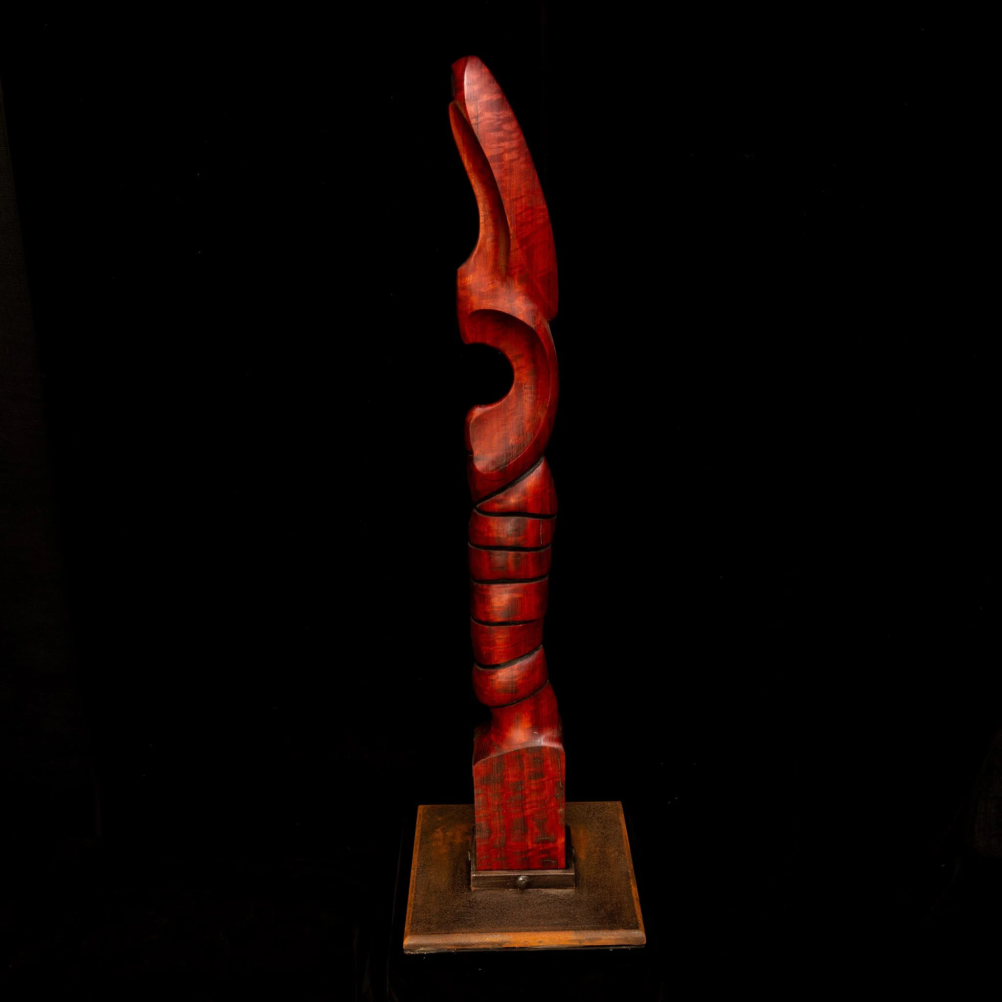 ‘Transmutation Anger’, expressing a fierceness, protective and forthright energy. A woman from New Zealand claimed that it reminded her of the taiaha, a traditional weapon of the Maori. Red and angry, it was what came about once I made a decision to stop sugar. No longer sugar coating my life’s experience, I found myself alone in my anger, facing my irritability, frustrations and rage. Once completed, I had felt a significant inward shift. Having moved into a more calm and objective view. Red gum species 1200 x 140 x 100. Mounted onto metal base of 360 X 320 X 25. Overall height of 1225.