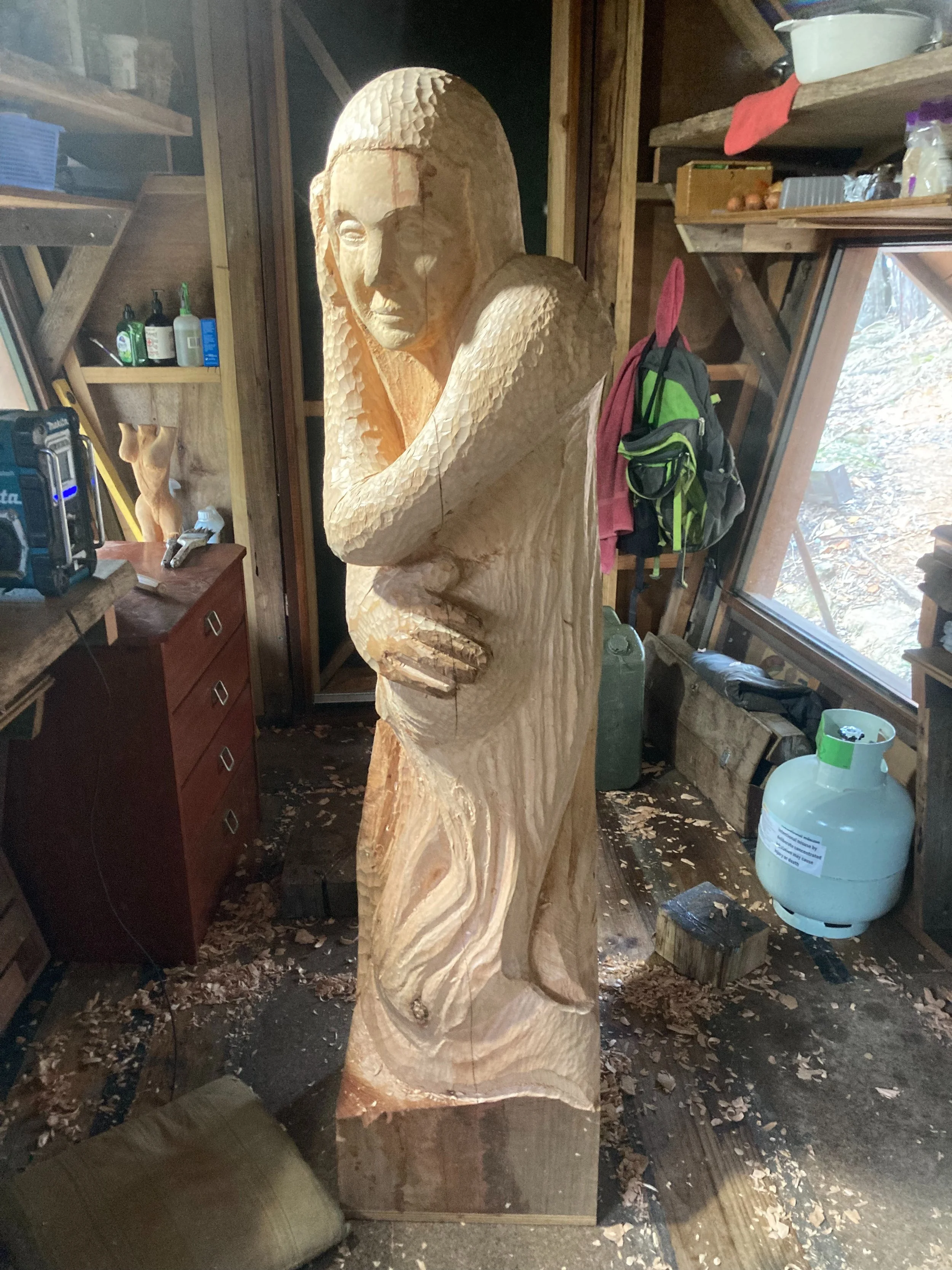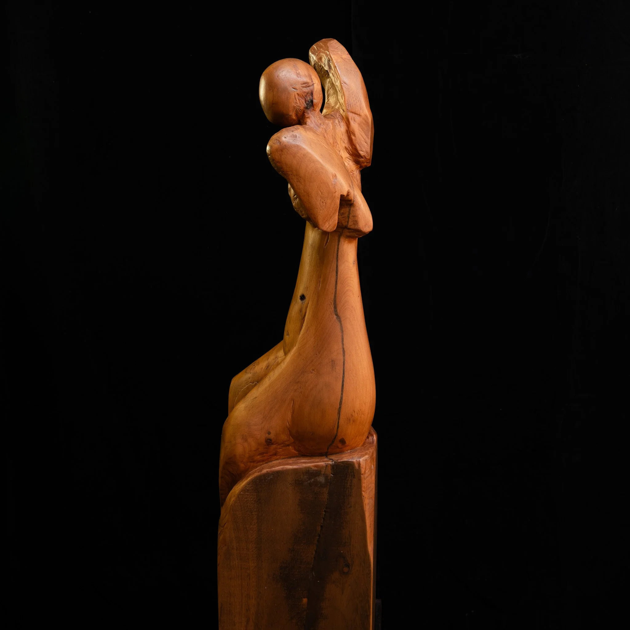 ‘Dryad’s’ stance, draping cloth over her feminine features and stability suggested to me that she was encased in this very sacred holding, like been held in union with the tree she came from. From Greek myth (Dryad), a female tree spirit. Carving approximately 560 x 200 x 200/ 1130 total height of wood block. Mounted onto a metal base at 285 High X 300 diameter. Overall height at 1415.